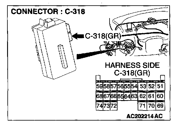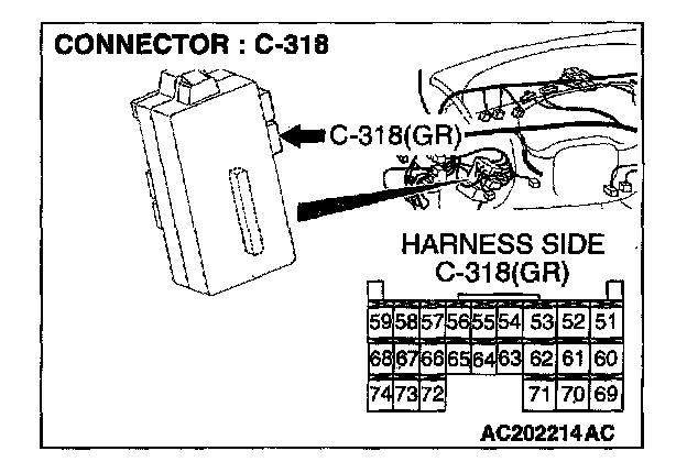 STEP 5. Check the washer fluid level switch connector A-32 and ETACS-ECU connector C-318 for loose, corroded or damaged terminals, or terminals pushed back in the connector.