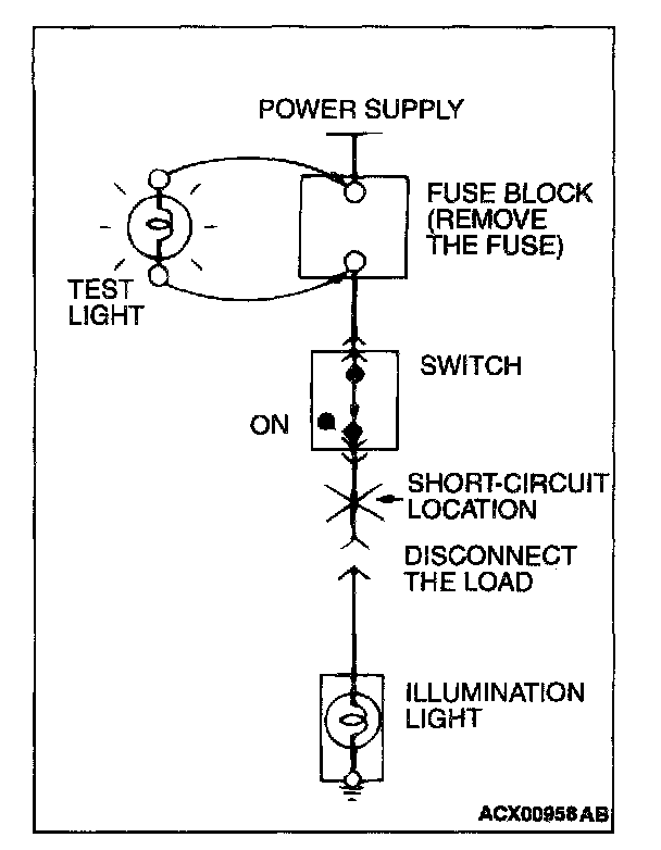 STEP 1. Remove the blown fuse and connect the test light across the fuse terminals (Circuit switch: OFF).
