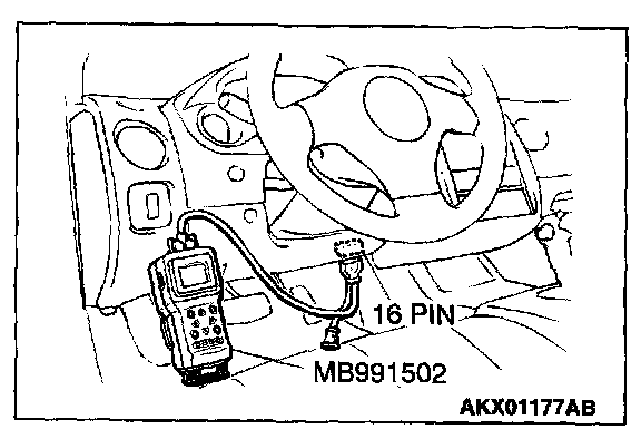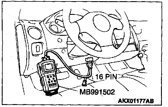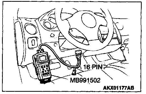 CAUTION: To prevent damage to scan tool MB991502, always turn the ignition switch to the "LOCK" (OFF) position before connecting or disconnecting scan tool MB991502.