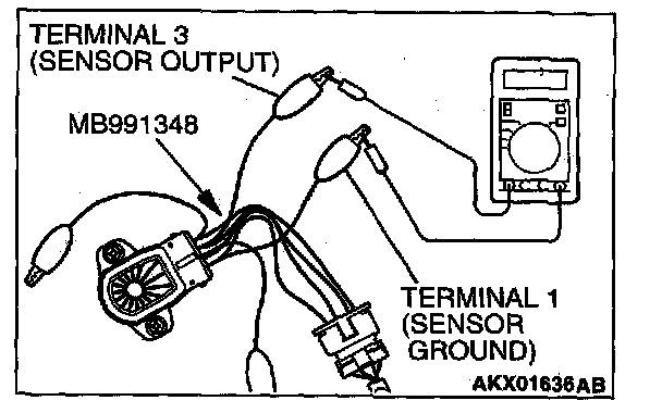 2. Connect a digital voltmeter between throttle position sensor terminal 3 (sensor output) and terminal 1 (sensor ground).