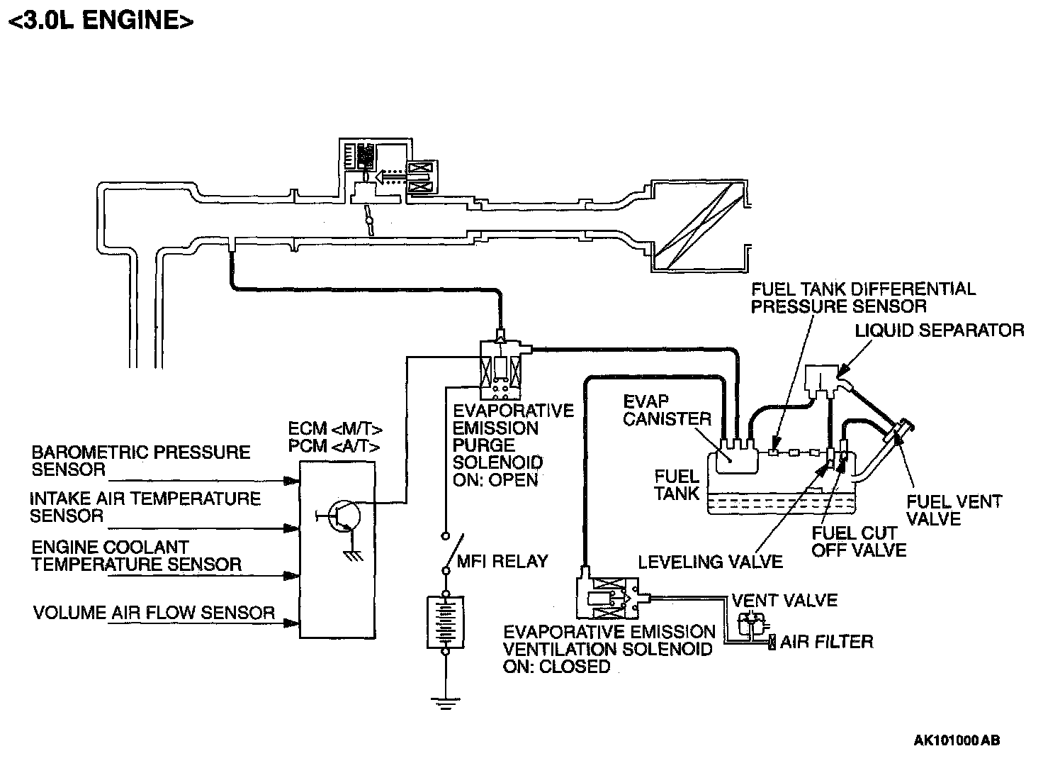 An EVAP ventilation solenoid is provided between the EVAP canister and atmosphere to monitor for OBD-II EVAP leaks. This solenoid is normally OFF. However, it turns ON when monitoring the OBD-II EVAP leaks and shuts off the atmosphere flow to the EVAP canister. Then the fuel tank differential pressure sensor monitors the fuel vapor pressure to detect OBD-II EVAP leaks. The fuel vent valve and the leveling valve prevent fuel from being overfilled. The fuel vent valve and the leveling valve prevents fuel leaks just if the vehicle is rolled over in an accident.