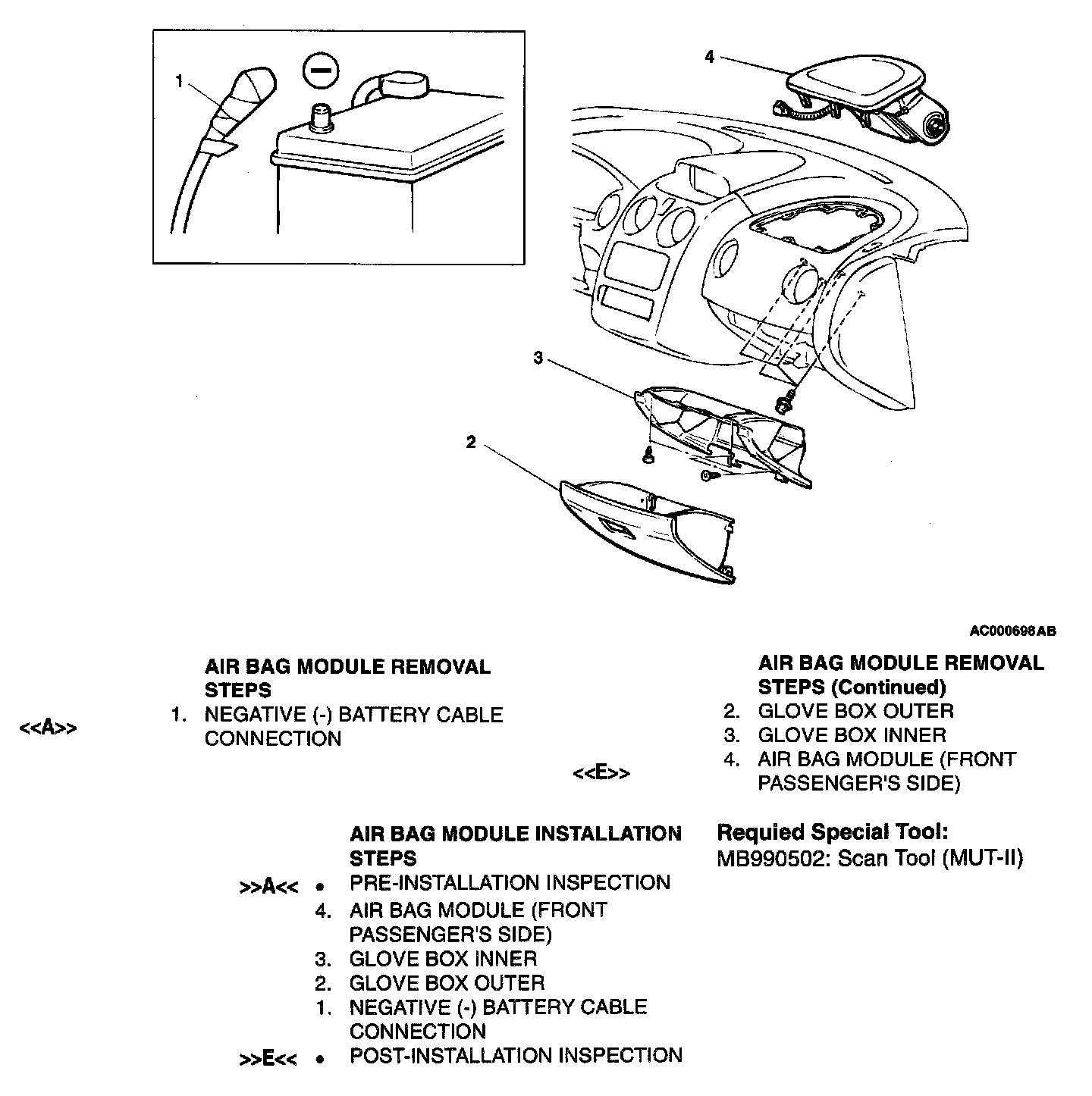 5. Conduct diagnostic test using scan tool MB991502 to ensure entire SRS operates properly.
