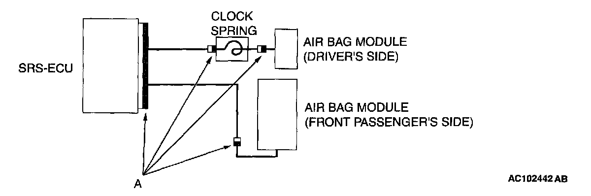 To enhance the system reliability, a connector lock switch is integrated in the SRS-ECU connector, the air bag module connectors, the clock spring connector (black connector "A" shown in the illustration below).