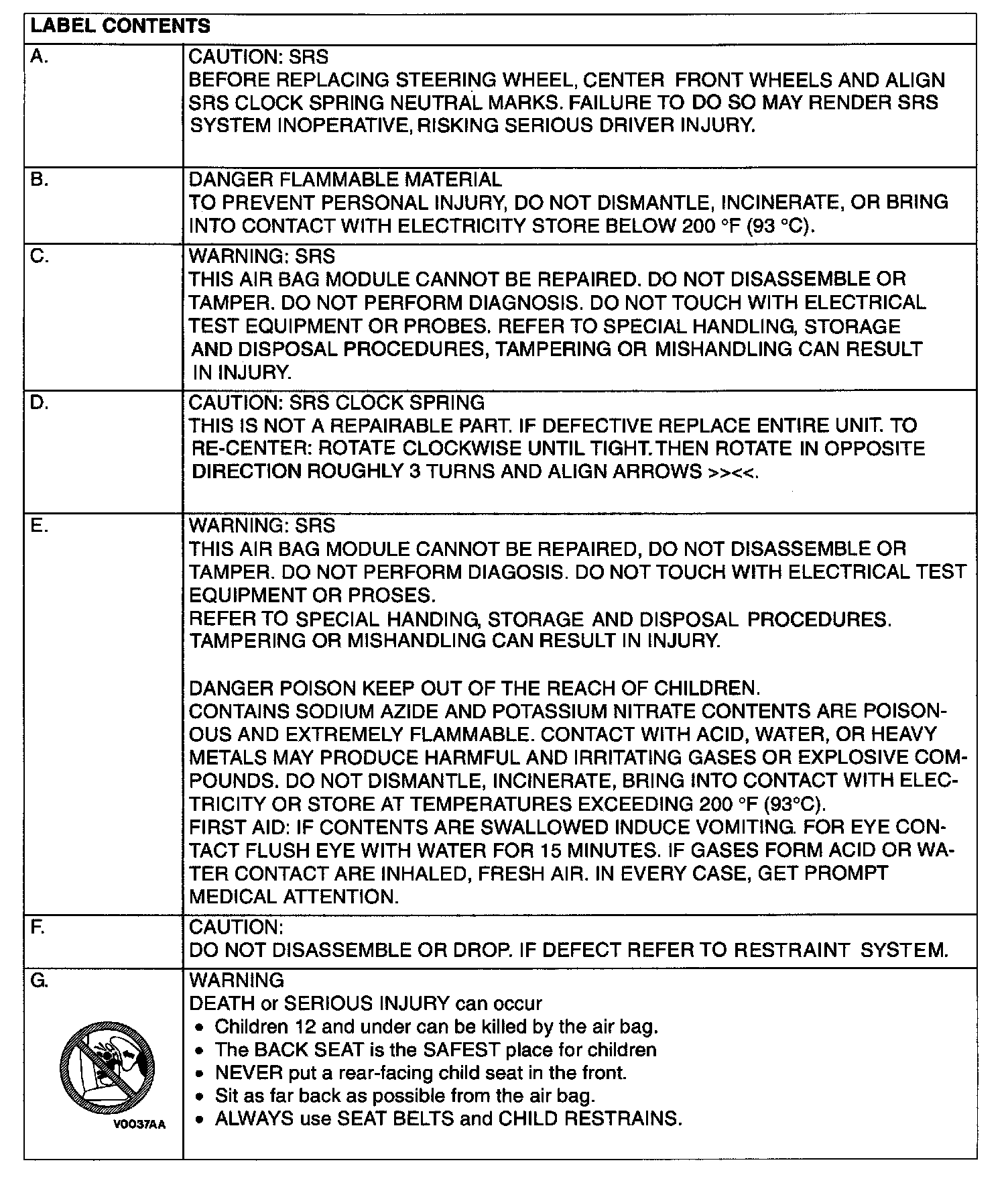 3. Warning labels must be heeded when servicing or handling SRS components. Warning labels can be found in the following locations.