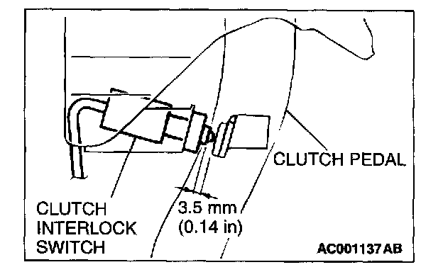 CLUTCH INTERLOCK SWITCH CHECK AND ADJUSTMENT1. Check to be sure that the interlock switch is as shown in the illustration when the clutch pedal is depressed at its full stroke 130 mm (5.1 inch). If the specified dimension is not met, loosen the clutch interlock switch 1/4 turns counterclockwise. Then slide the switch to the specified dimension, and turn the switch 1/4 turns clockwise to lock.