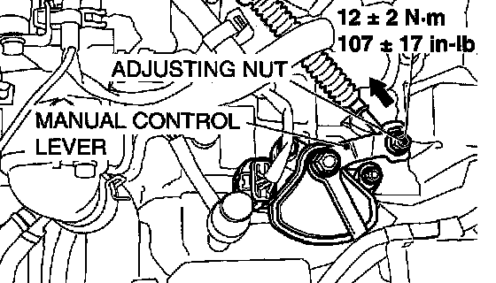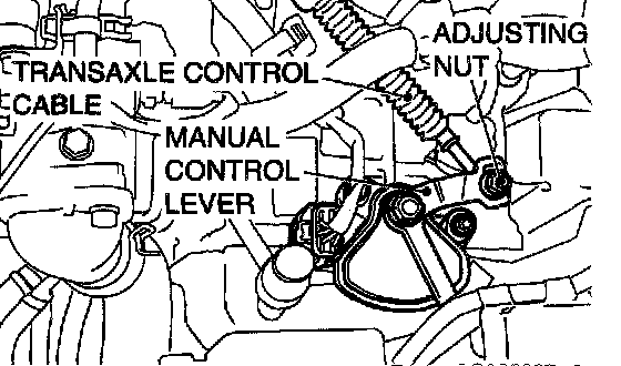 6. Gently push the transaxle control cable in the direction of the arrow, until the cable is taut. Tighten the adjusting nut.