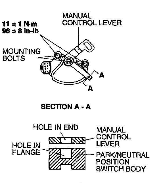 4. Loosen the park/neutral position switch body mounting bolts and turn the park/neutral position switch body so the hole in the end of the manual control lever and the hole (section A - A in the figure on the left) in the flange of the park/neutral position switch body flange are aligned.