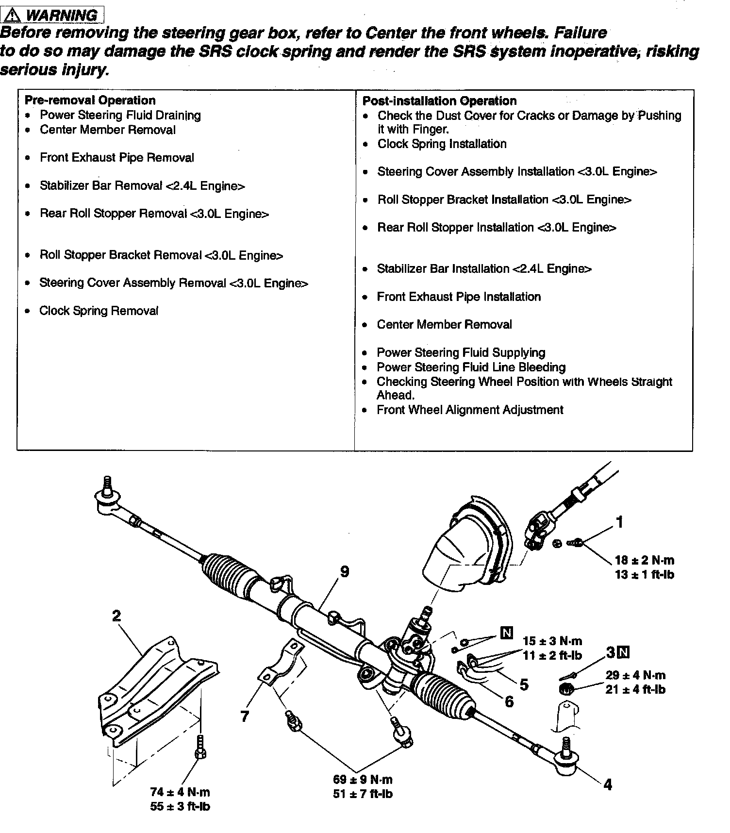 WARNING: Before removing the steering gear box center the front wheels. Failure to do so may damage the SRS clock spring and render the SRS system inoperative risking serious injury.
