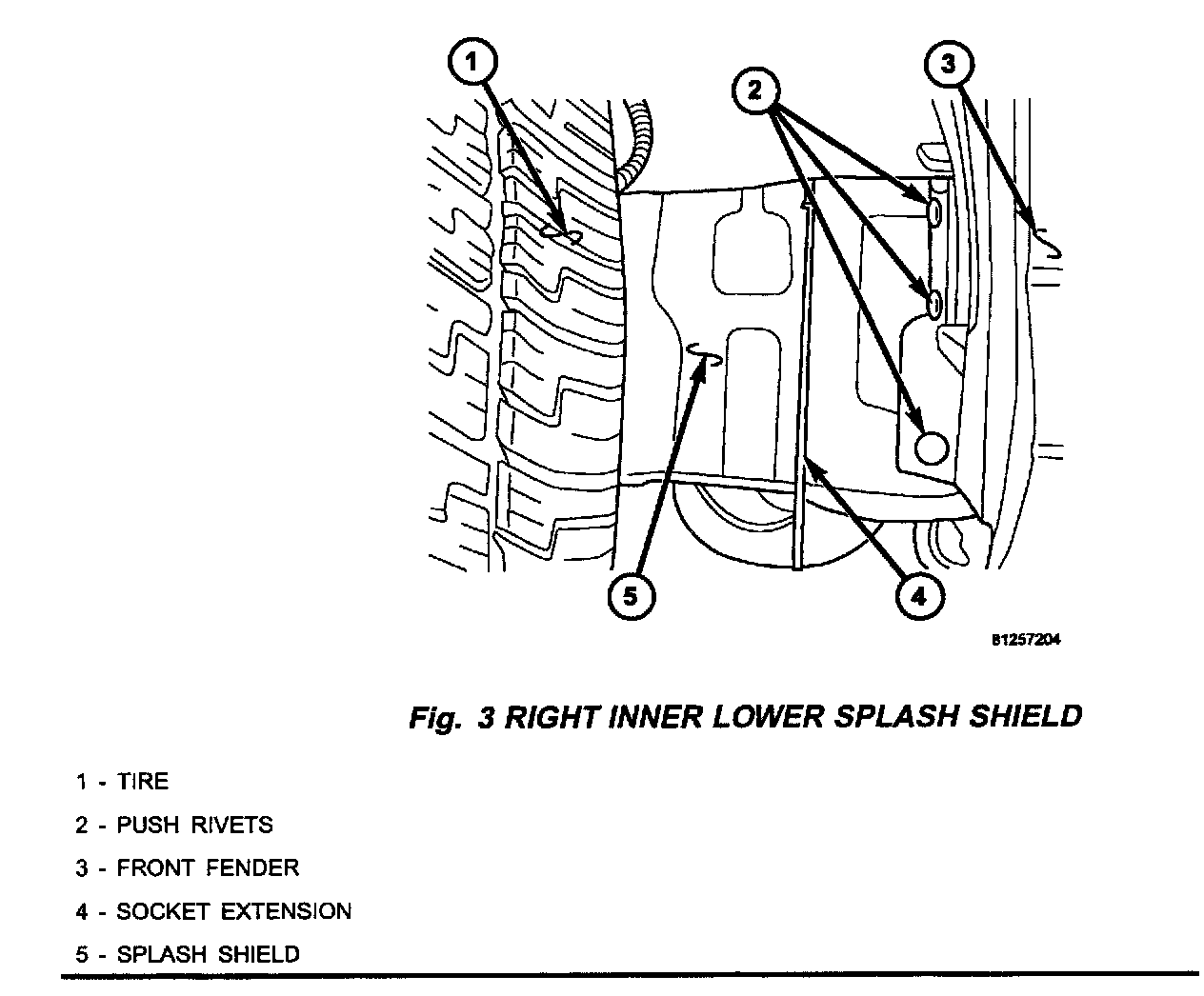 3. Remove 3 bolts and 3 push pins in order to remove the right front fender inner lower splash shield (Fig. 3).