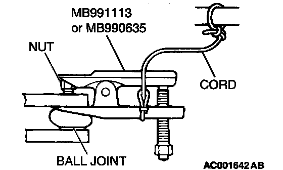 CAUTION: Before using special tool MB991113 or MB990635, loosen the tie rod end mounting nut. Only loosen the nut; do not remove it from the ball joint.