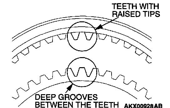 2. Install the synchronizer sleeve so that the areas with teeth that have raised tips (three areas total) are aligned with the areas on the synchronizer hub that have deep grooves between the teeth (three areas total).
