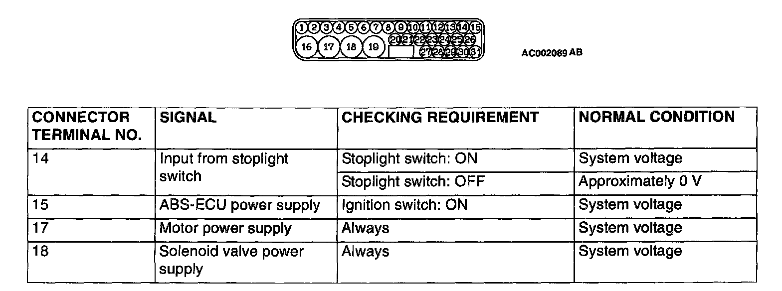 NOTE: Do not measure terminal voltage for approximately three seconds after the ignition switch is fumed to "ON." The ABS-ECU performs the initial check during that period.