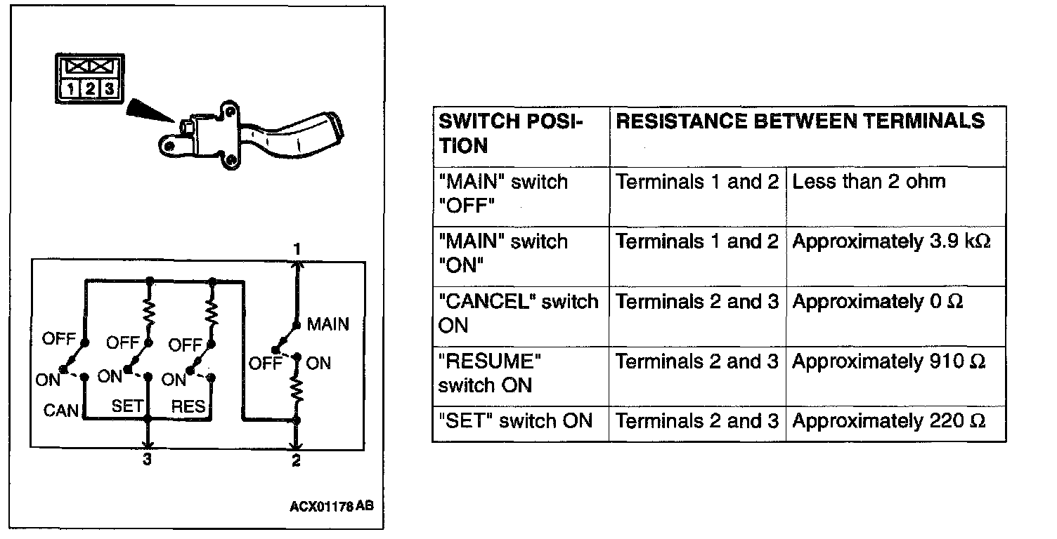 Measure the resistance between the terminals when each of the "SET," "RESUME," "CANCEL" and "MAIN" switches is pressed. If the values measured at the time correspond to those in the table below, the resistance values are correct.