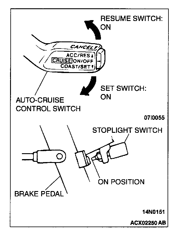 1. Turn the ignition switch to the "ON"position while holding the auto-cruise control switch in the "SET" (down) position. Then, within one second, more the auto-cruise control switch up to the "RES" position.