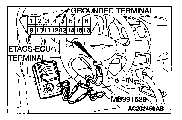 1. Use special tool MB991529 to connect a voltmeter between ground terminal 4 or 5 and ETACS-ECU terminal 9 of the data link connector.