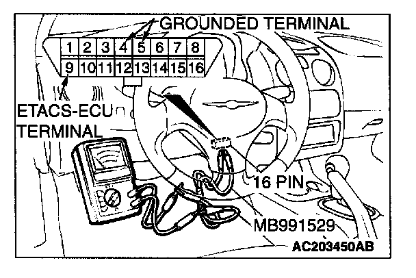 1. Use special tool MB991529 to connect a voltmeter between ground terminal 4 or 5 and ETACS-ECU terminal 9 of the data link connector.
