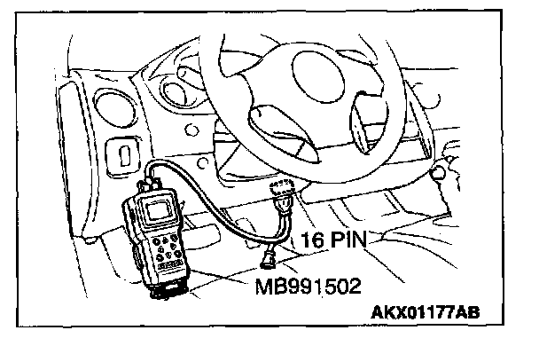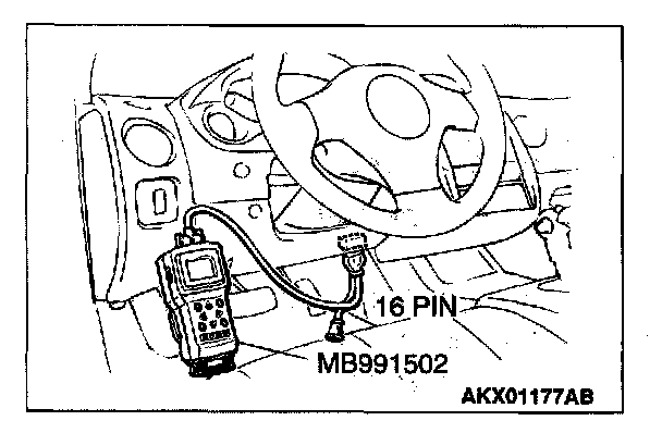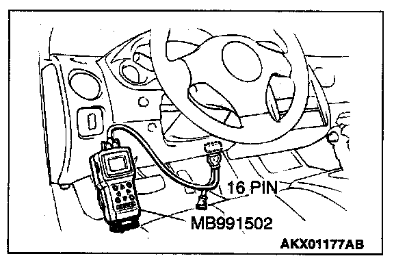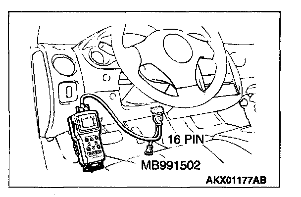 CAUTION: To prevent damage to scan tool MB991502, always turn the ignition switch to the "LOCK" (OFF) position before connecting or disconnecting scan tool MB991502.