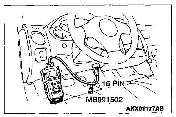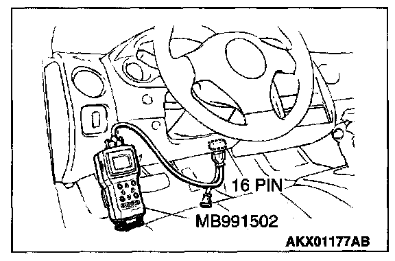 CAUTION: To prevent damage to scan tool MB991502, always turn the ignition switch to the "LOCK" (OFF) position before connecting or disconnecting scan tool MB991502.