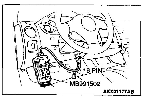 CAUTION: To prevent damage to scan tool MB991502, always turn the ignition switch to the "LOCK" (OFF) position before connecting or disconnecting scan tool MB991502.