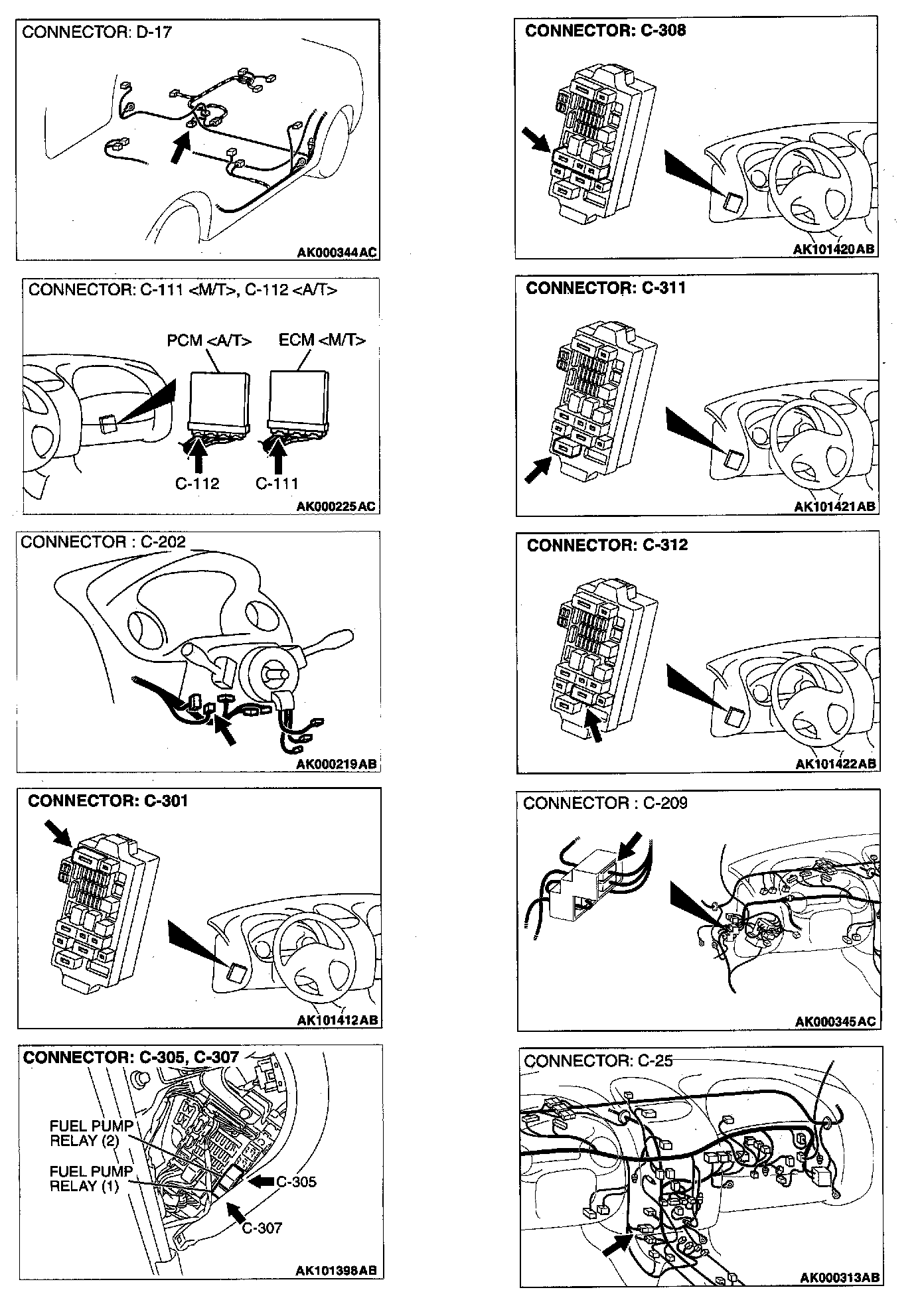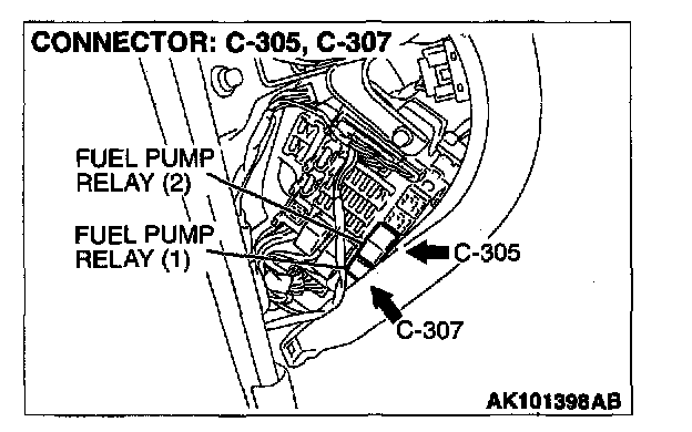 STEP 2. Check connector C-307 at fuel pump relay 1 and connector C-305 at fuel pump relay 2 for damage.