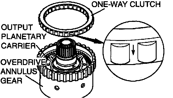 Insert the one-way clutch into the overdrive annulus gear so that the arrow points towards the output planetary carrier.