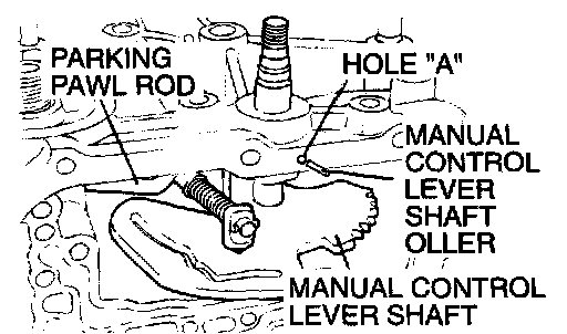 87. Align hole "A" with the groove in the manual control lever shaft. Insert the manual control lever shaft roller into hole "A".