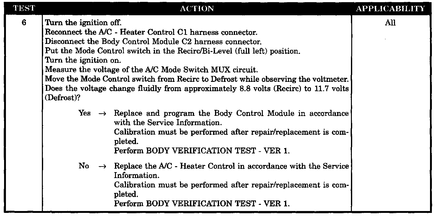 The A/C - Heater Control provides a 5 volt pull-up to the mode request selector. The BCM reads the signal from the A/C - Heater Control mode request and positions the mode door accordingly. If the voltage on this pin is below 0.1 volts, the DTC will set, and the BCM will place the mode door in a default position.