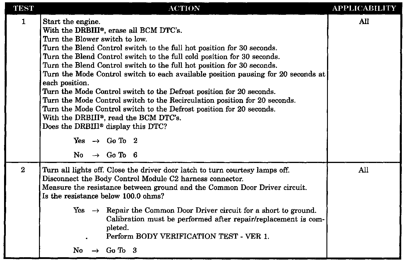 This DTC will set if the BCM detects one or more of the following outputs shorted to ground: mode door driver, blend door driver, recirculation door driver or the common door driver.
