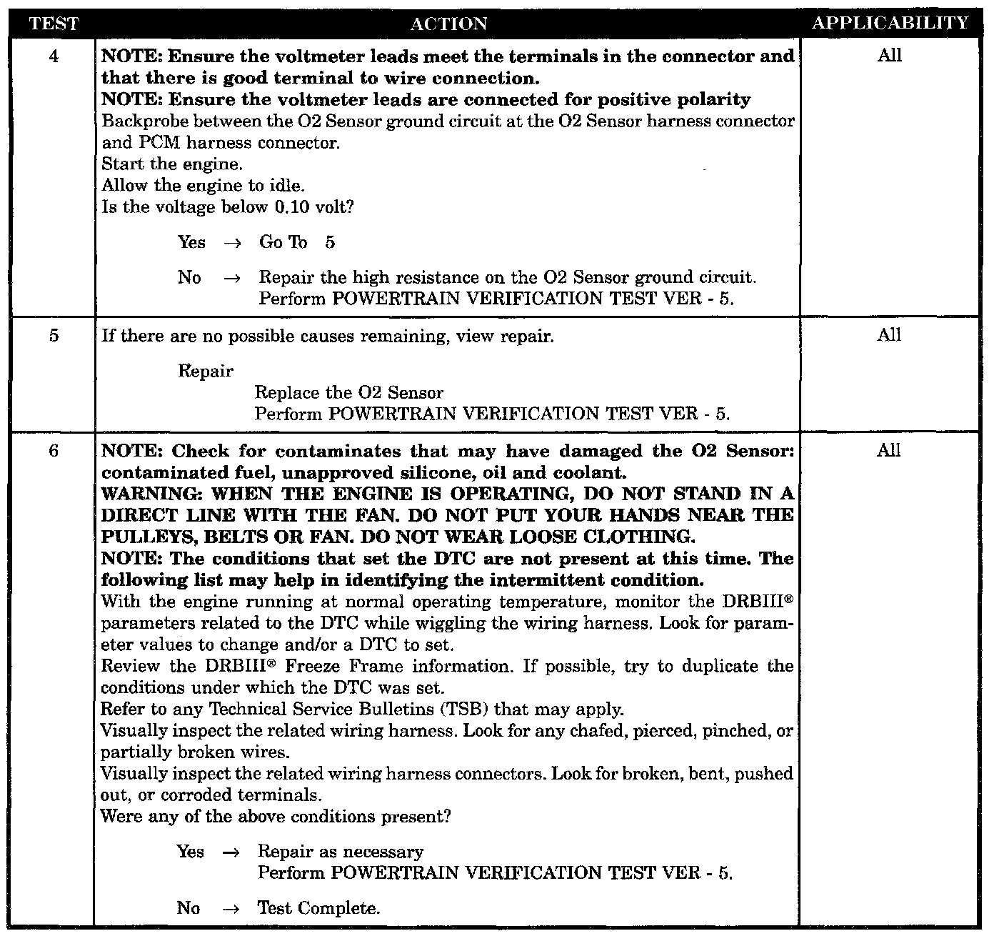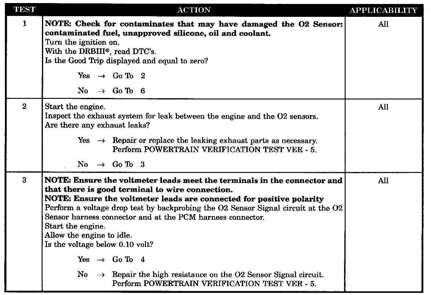 Start engine. Allow engine to idle. For 1st part of test, if limits are exceeded, test passes. If not 2nd part of test runs. Ambient Temp great than 6.6 °C (44 °F), Baro greater than 22.13 Hg, Battery voltage 10.5 volts, MAP greater than 11.9 and less than 18.15" Hg, RPM greater than 1216 and less than 1984 and VSS greater 19 and less than 46 MPH.