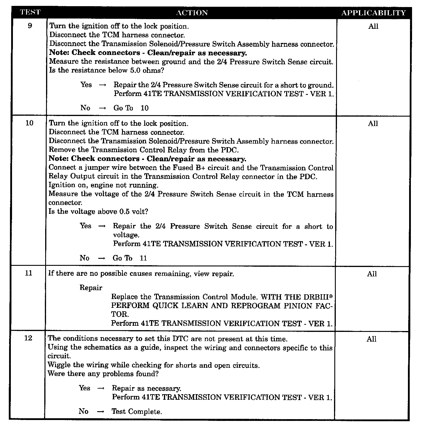 Set condition: After a shift into a forward gear, with engine speed > 1000 RPM, the TCM momentarily turns on element pressure to the clutch ckts that don't have pressure to identify the correct pressure sw closes. If the pressure sw does not close 2 times the code sets.