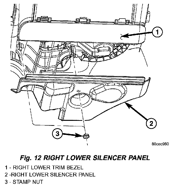 1. Place right lower silencer panel into position (Fig. 12).