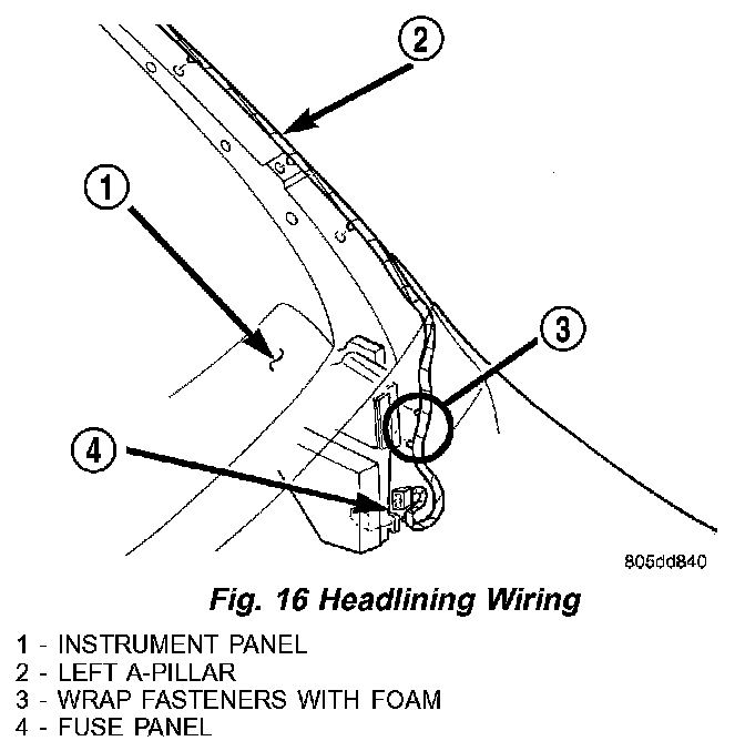 NOTE: It is not possible to reinstall the push in fasteners holding the wiring harness to the instrument panel bracket and to the fuse panel area. Wrap these two fasteners with foam tape to prevent buzz, squeak, and rattle complaints (Fig. 16).