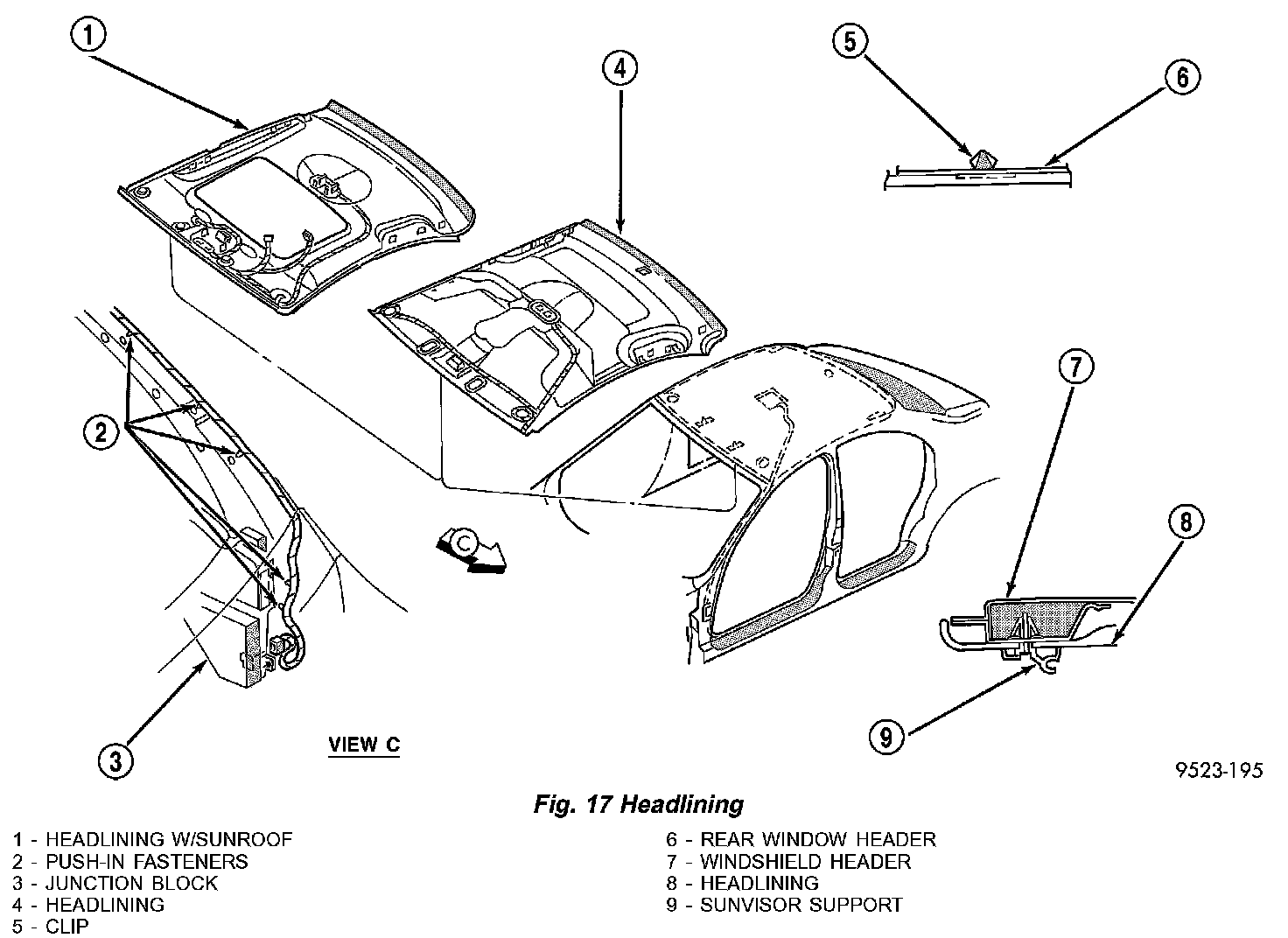 12. Using Special Tool 6967, disengage headline rear locating clip holding headlining to roof above rear window (Fig. 17).