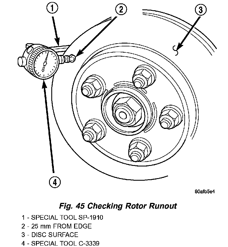 On-vehicle rotor runout is the combination of the individual runout of the hub face and the runout of the rotor. (The hub and rotor runouts are separable). To measure rotor runout on the vehicle, first remove the tire and wheel assembly. Reinstall the wheel mounting nuts on the studs, tightening the rotor to the hub. Mount the Dial Indicator, Special Tool C-3339, with Mounting Adapter, Special Tool SP1910 on steering arm. The dial indicator plunger should contact braking surface of rotor approximately 25 mm (one inch) from outer edge of rotor. Check lateral runout on both sides of the rotor, marking the low and high spots on both. Runout limits can be found in the table at the end of this brake rotor information.
