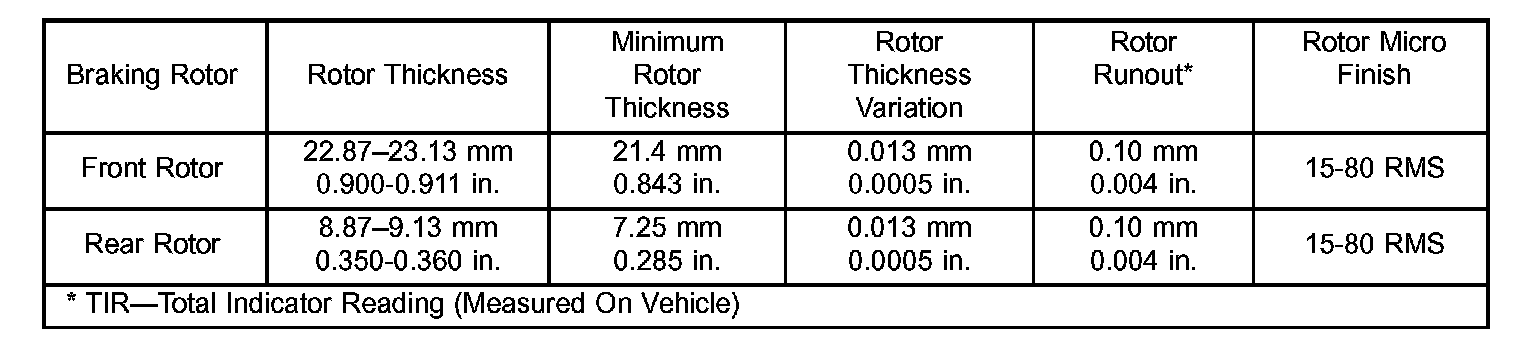 Rotor thickness variation measurements should be made in conjunction with measuring runout. Measure thickness of the brake rotor at 12 equal points around the rotor braking surface with a micrometer at a radius approximately 25 mm (1 inch) from edge of rotor. If thickness measurements vary by more than 0.013 mm (0.0005 inch), the rotor should refaced or replaced.