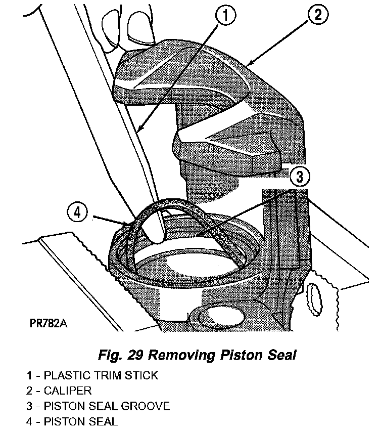 6. Using a soft tool such as a plastic trim stick, work the piston seal out of its groove in caliper piston bore. Discard the old seal.