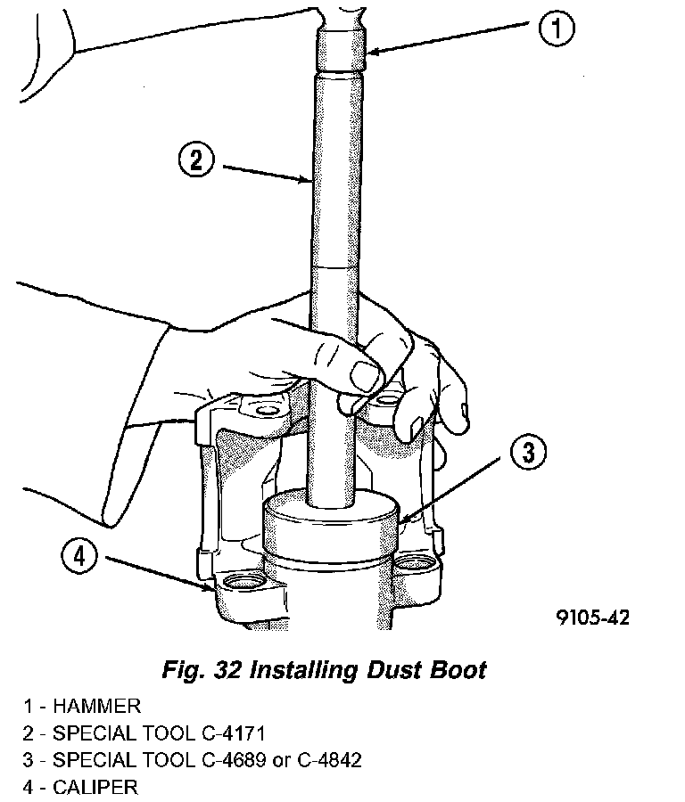 6. Using a hammer and Installer, Special Tool C-4689 or C-4842 (depending on piston size), and Handle, Special Tool C-4171, drive the boot into the counterbore of the caliper as necessary.