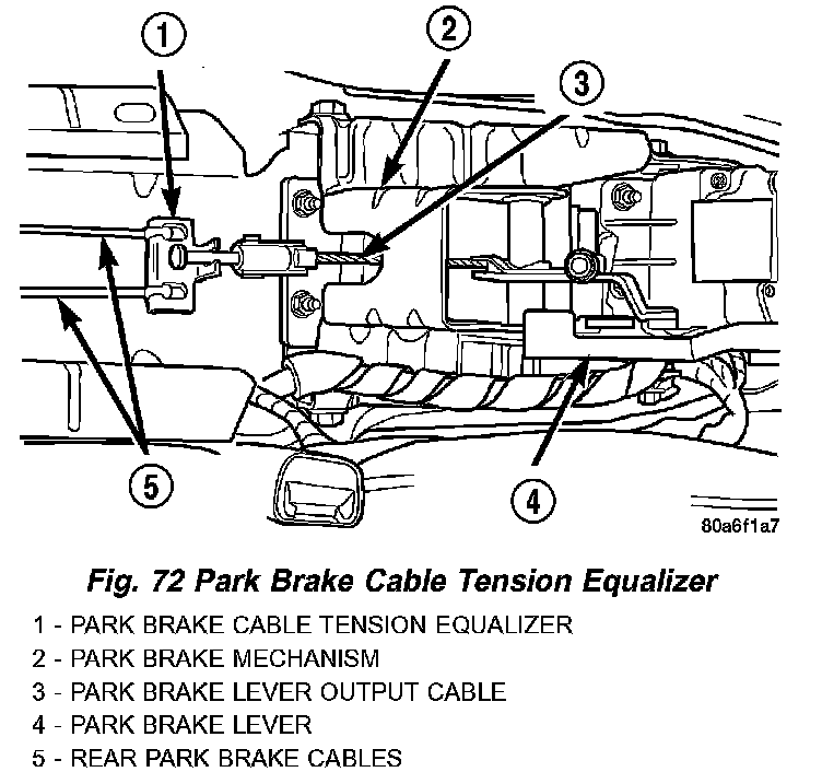 4. Install a NEW park brake cable tension equalizer on the park brake lever output cable and rear park brake cables.