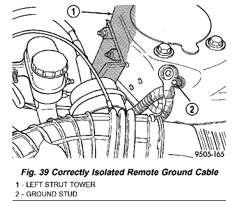 2. Correctly isolate remote ground cable by installing the ground cable insulator on the strut tower ground stud as shown. This will prevent accidental grounding of the remote ground cable.