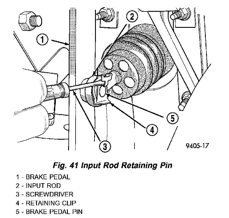 4. Connect power brake vacuum booster input rod to brake pedal pin and install a NEW retaining clip. Use only a new retainer clip DO NOT USE the old clip.