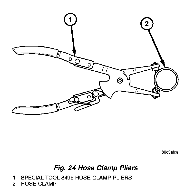 To remove a spring type hose clamp, use Special Tool 8495 Hose Clamp Pliers, or equivalent, to compress the hose clamp.