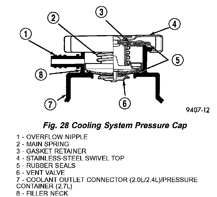 CAUTION: Vehicles equipped with 2.0L/2.4L engines use a different pressure cap than vehicles equipped with 2.7L engines. The pressure caps are NOT interchangeable. Verify proper pressure cap part number.