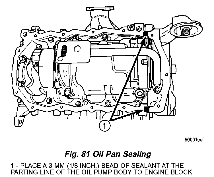 1. Apply Mopar Engine RTV GEN II at the oil pump to engine block parting line (Fig. 81).