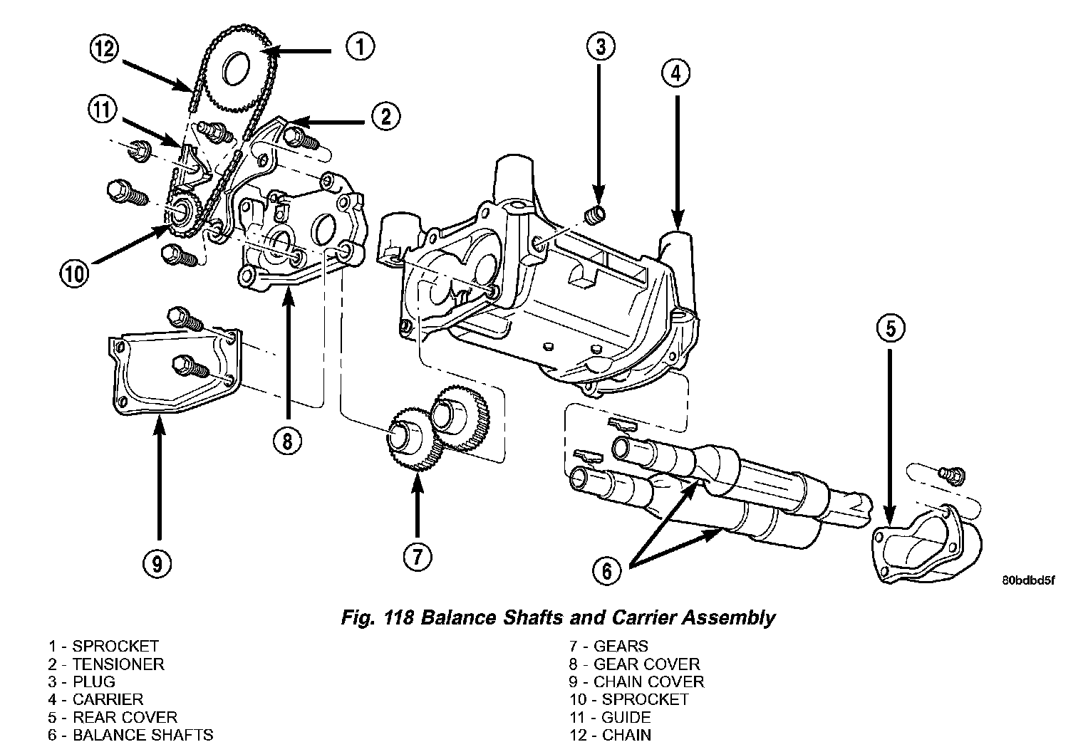 The 2.4L engine is equipped with two nodular cast iron balance shafts installed in a cast aluminum carrier attached to the lower cylinder block (Fig. 118).