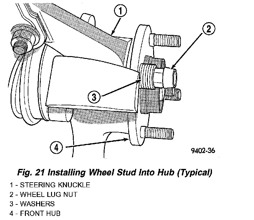 1. Install replacement wheel stud into flange of hub and bearing assembly. Install washers on wheel stud, then install a wheel lug nut on stud with flat side of lug nut against washers.