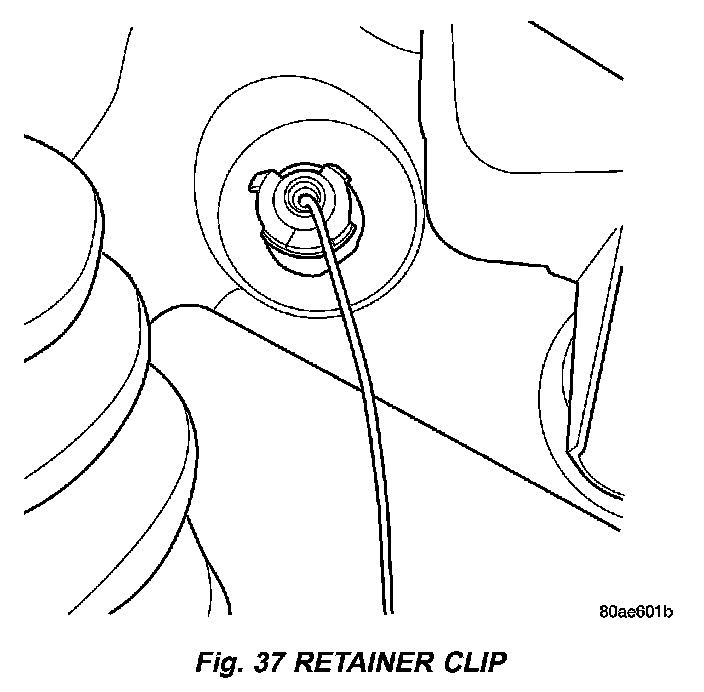 5. At the dash panel, install the cable retainer clip between the end of the throttle cable dash fitting and grommet (Fig. 37).