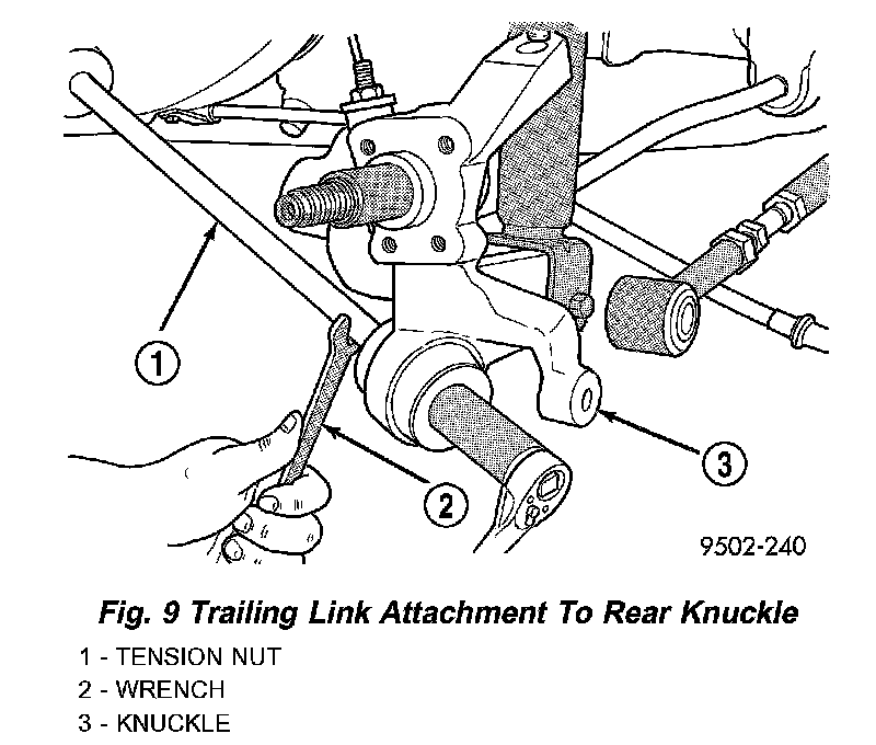 12. Remove the nut and washer attaching the trailing link to the rear knuckle. Use a wrench on the flat of the trailing link to keep it from turning when removing nut.