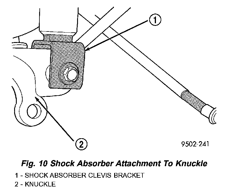 13. Remove the shock absorber clevis bracket to knuckle attaching nut and bolt.