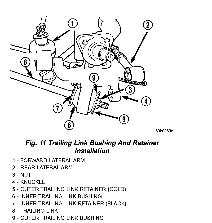 2. Install knuckle on trailing link. Install the trailing link outer bushing, gold bushing retainer and retaining nut on trailing link. Using a large adjustable wrench, to keep trailing link from rotating securely tighten the trailing link retaining nut to a torque of 99 Nm (73 ft. lbs.).