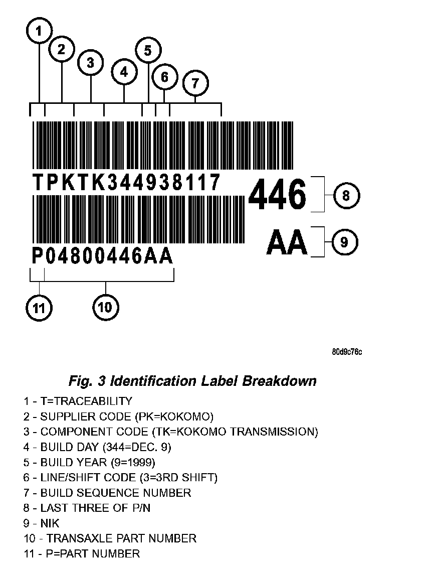 The label contains a series of digits that can be translated into useful information such as transaxle part number, date of manufacture, manufacturing origin, plant shift number, build sequence number, etc. Refer to (Fig. 3) for identification label breakdown.